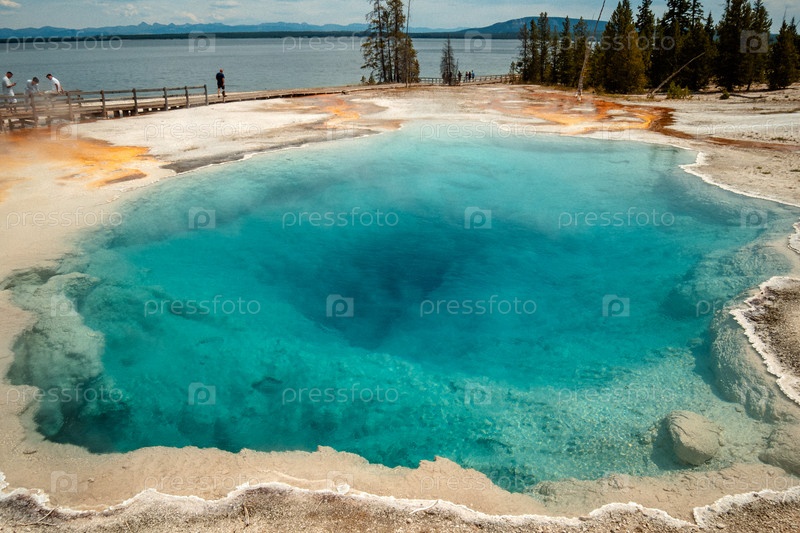 Живой геотермальный бассейн в Йеллоустоне демонстрирует поразительные минеральные месторождения и пышные природные пейзажи