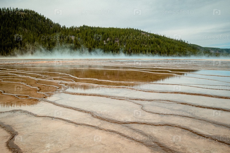 Спокойный геотермальный ландшафт с размытыми рефлексивными бассейнами и паром