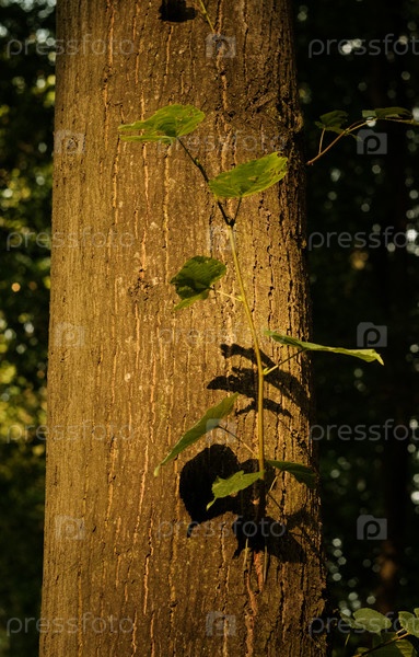 Подробный вид ствола дерева, окруженного мохом и деликатными летящими растениями в теплом лесном свете