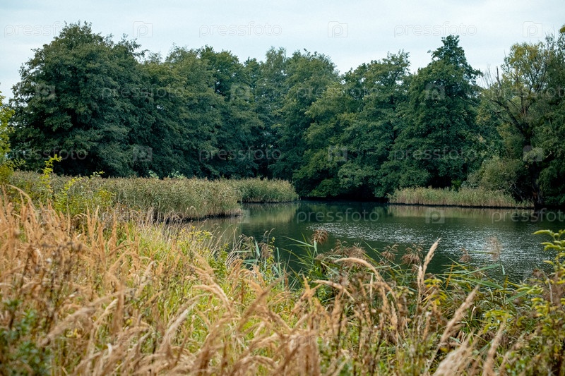 Безмятежная водная сцена с отражающим прудом, окруженным густой растительностью и мягкой световой атмосферой