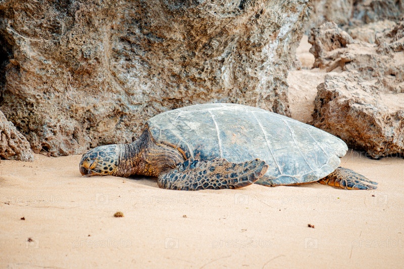 Спокойная зеленая морская черепаха отдыхает рядом с скалами под теплым солнечным светом в природе