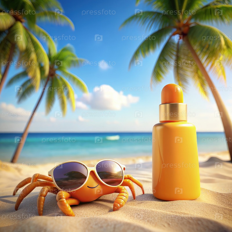 Краб отдыхает на пляже с солнцезащитным кремом