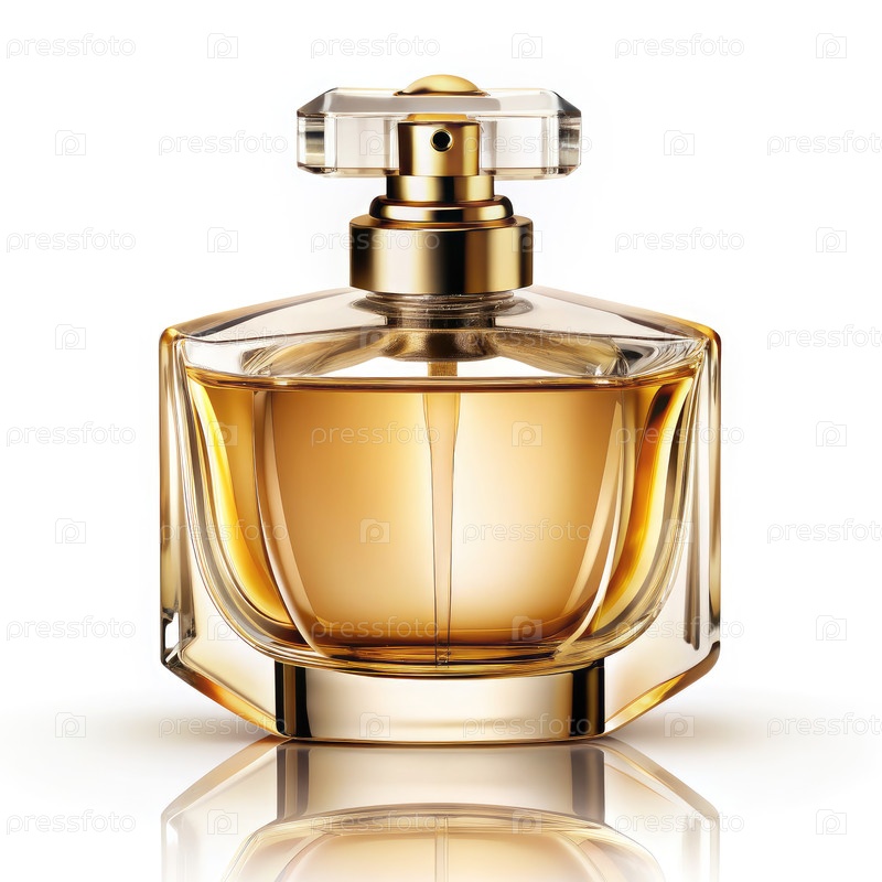 Бутылка роскошного парфюма с золотыми акцентами на белом фоне