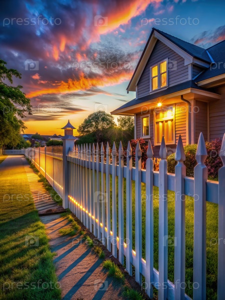 Белый пикетный забор и Дом в сумерках. генеративная белая ИИ