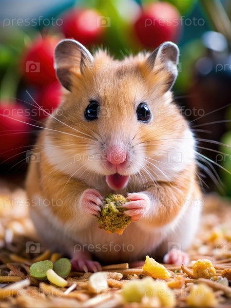 Очаровательный золотой хомстер наслаждается перекусом на соломенной кровати