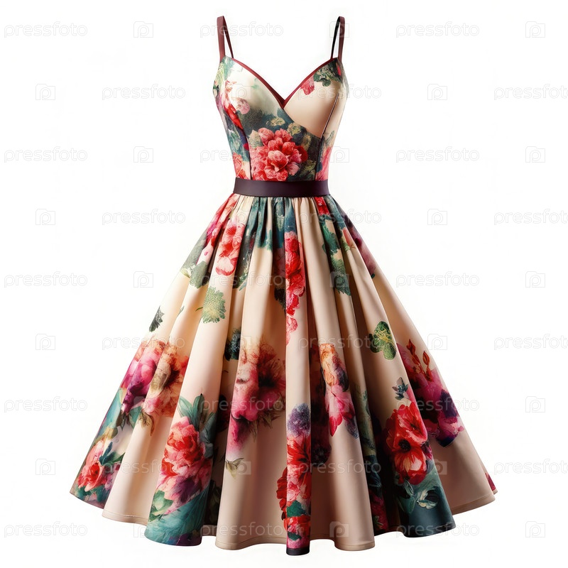 Бежевый цветочный печатный платье без ремней с черным поясом на белом фоне