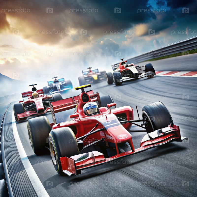 Высокооктановые автомобили Формулы гоняются под драматическим небом