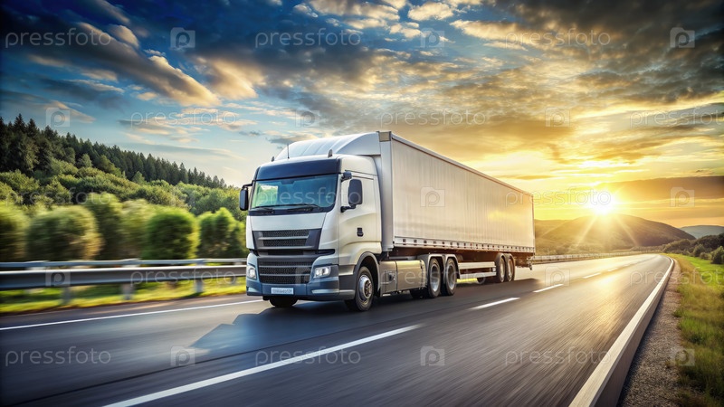 Белый полугрузовик едет по шоссе на закате. генеративный ИИ