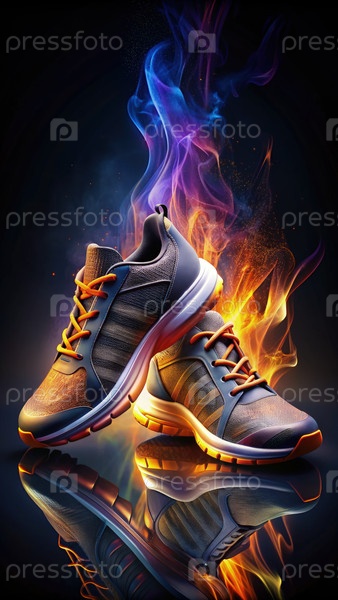 Пара голубой и оранжевой спортивной обуви, окруженная красочными пламенами