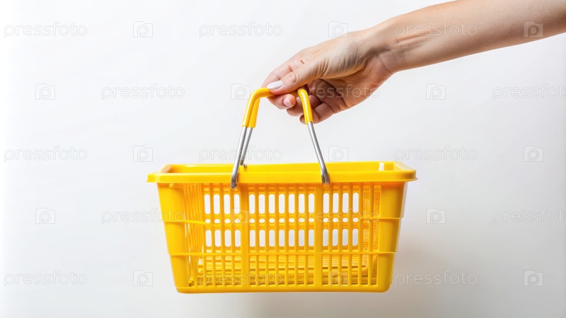 Рука держит желтую пластиковую корзину для покупок на белом фоне
