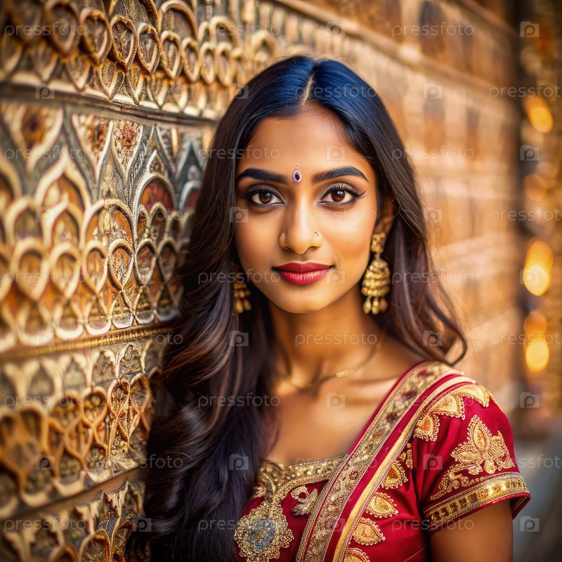 Молодая индийская женщина в красном сари позирует перед украшенной стеной
