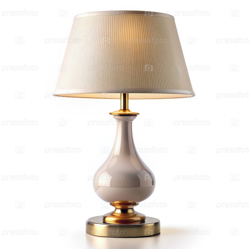 Белая керамическая настольная лампа с тканевым оттенком на белом фоне
