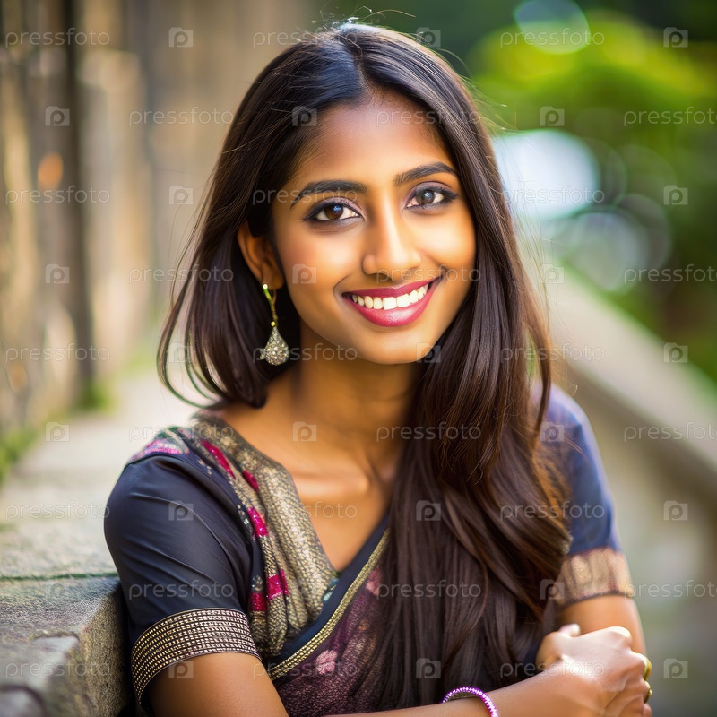 Улыбающаяся индийская женщина, одетая в сари на открытом воздухе