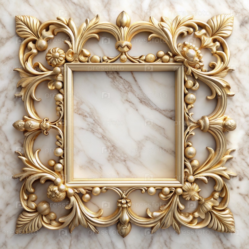 Украшенная золотая рама с цветочными резьбами на мраморном фоне