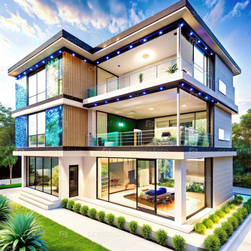 Современный интеллектуальный дом с интегрированными технологиями и большими окнами