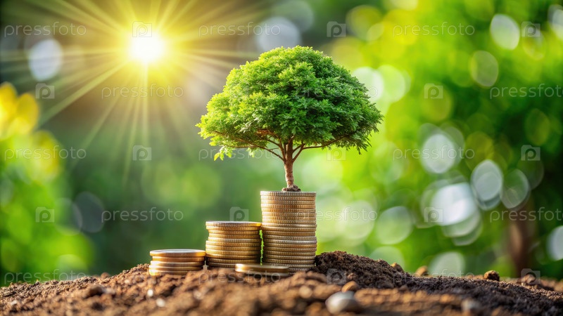 Небольшое дерево, растущее из кучи монет под солнечным светом