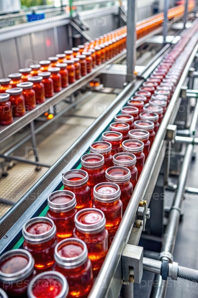 Производственная линия Jam Conveyor Belt Carrying Jars In Industrial Facility. генеративный ИИ