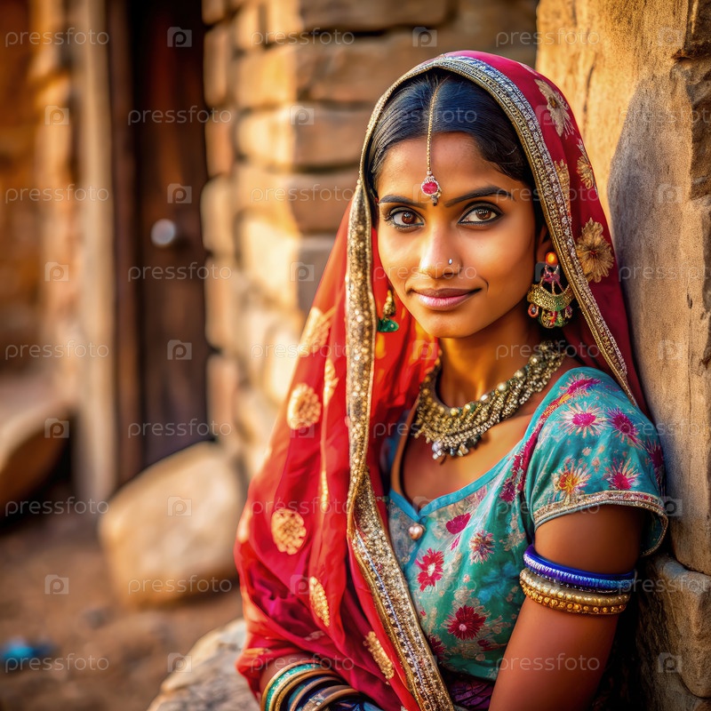 Молодая индийская женщина в традиционном платье опирается на кирпичную стену