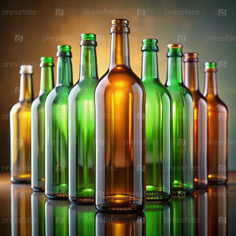 Ряд стеклянных бутылок в зеленом и коричневом цветах на отражающей поверхности
