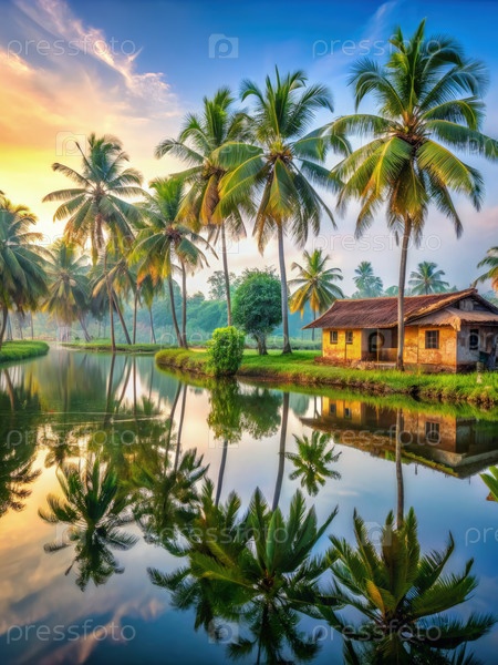 Спокойные водоемы Кералы на восходе солнца с пальмами, отражающимися в неподвижной воде