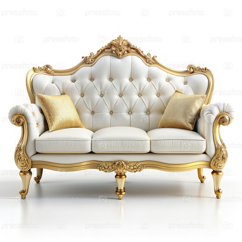 Белый и золотой украшенный диван на белом фоне