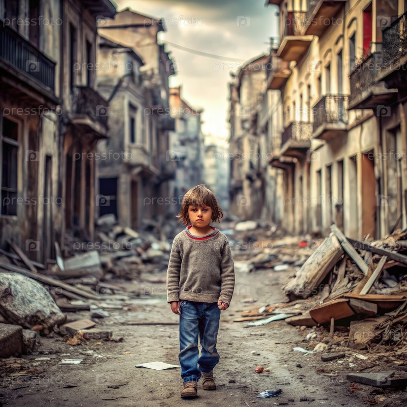 Молодой мальчик ходит по разрушенной городской улице