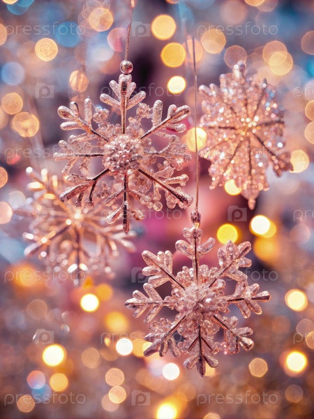 Деликатные розовые стеклянные орнаменты снежинки, висящие перед теплыми огнями