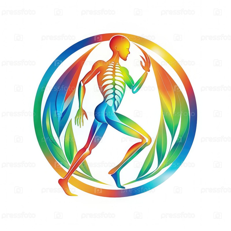 Красочная иллюстрация бегущего человеческого скелета с зелеными листьями