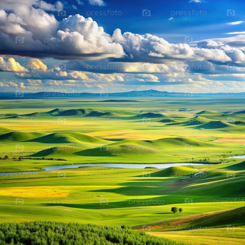Rolling Green Hills и извивающаяся река на лугах Внутренней Монголии