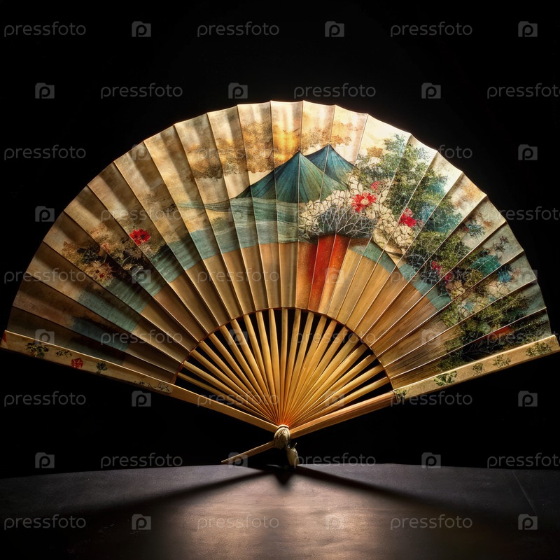 Японский ручной вентилятор с изображением горной сцены. генеративный ИИ A