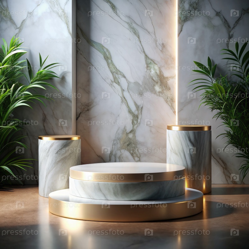 Мраморный подиум с золотыми акцентами и пышной зеленью. генеративная ИИ