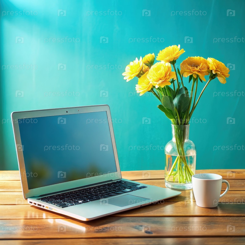 Ноутбук и желтые цветы на деревянном столе в солнечной комнате