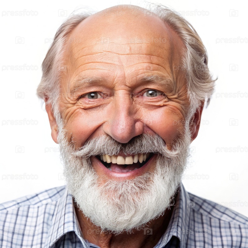 Счастливый старший мужчина с белой бородой и усами улыбается в студии