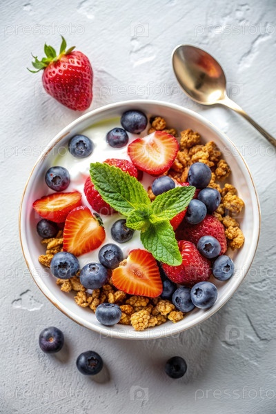 Главный вид миски с гранолой, йогуртом, клубникой и черники