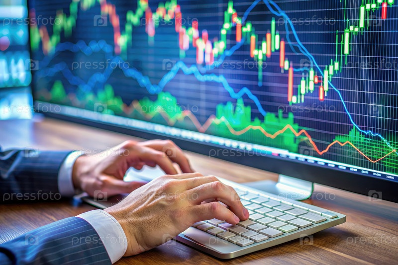 Ключевое изображение рук, печатающих на клавиатуре с помощью графиков фондового рынка, отображаемых на мониторе компьютера