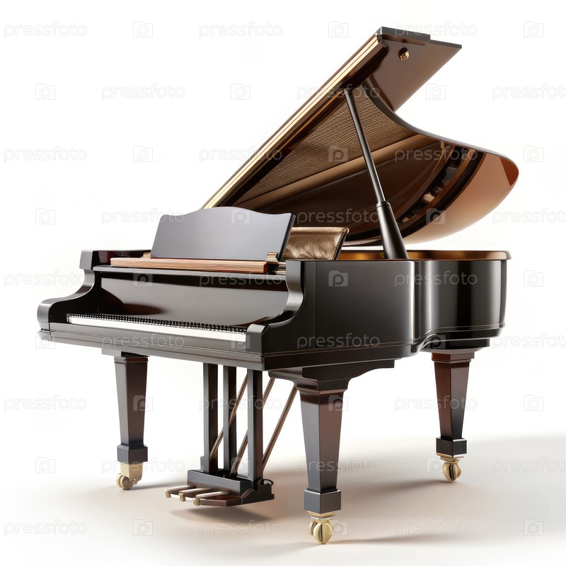 Черное фортепиано с открытой крышкой на белом фоне