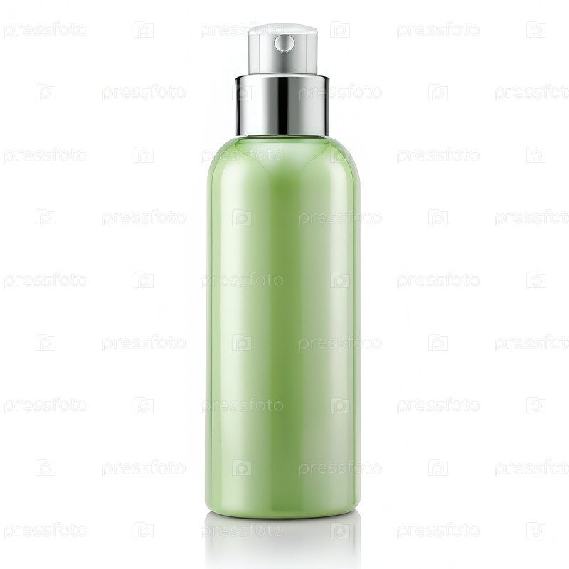 Светло-зеленая бутылка шампуня с серебряной крышкой на белом фоне