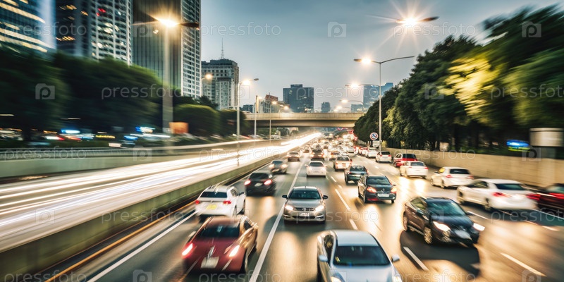 Вечерний трафик в час пик на городской автомагистрали с размытыми огнями