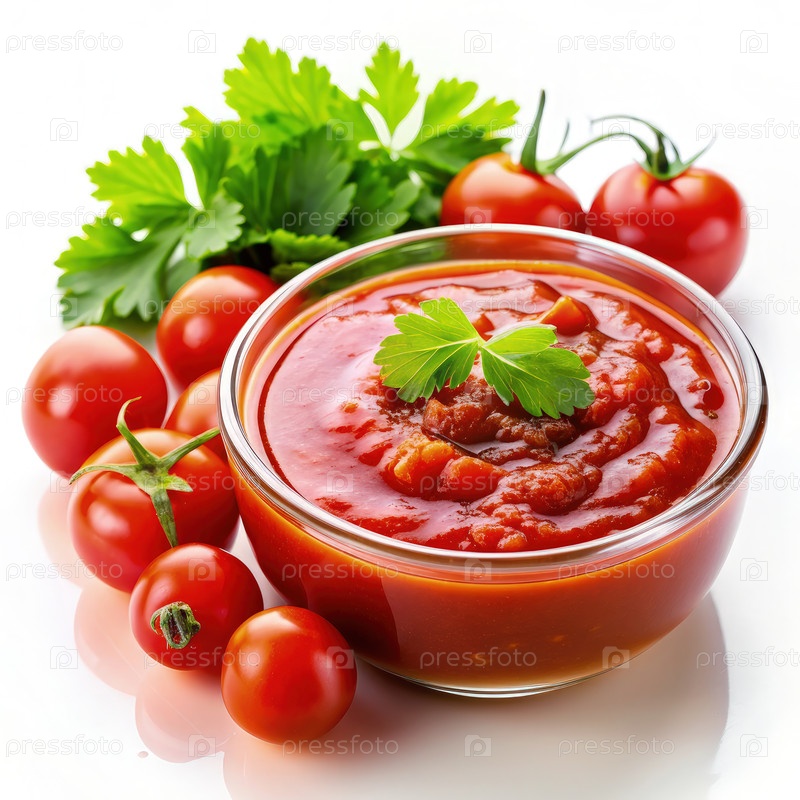 Свежий томатный кетчуп в стеклянной миске с персиком и вишневыми помидорами на белом фоне