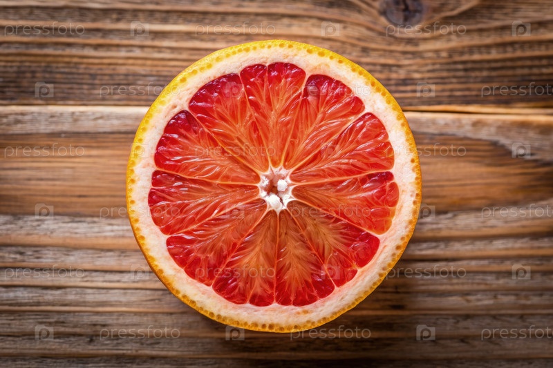 Близкий взгляд на клочок красного грейпфрута на деревянной поверхности