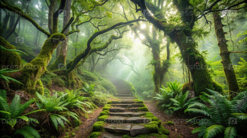Каменные ступени ведут вверх через туманный, покрытый мхом лес