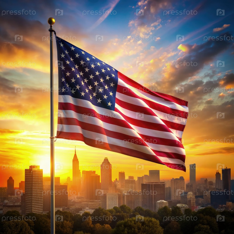 Американский флаг развевается на восходе солнца над горизонтом Атланты в День независимости