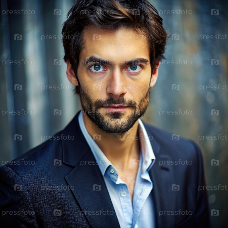 Мужчина в синем костюме позирует для портрета в городской обстановке