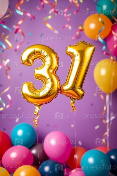 Гелиевый баллон на день рождения номер тридцать один, фигура из золотых букв 31 праздник праздничный фон