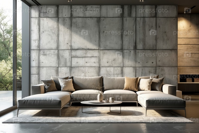 AI генеративный современный уютный интерьер гостиной бетонная серая стеновая мебель комфортабельный дизайн дома