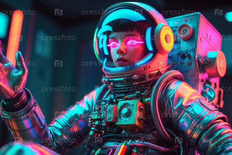 Человекоподобная женщина в футуристическом неоновом костюме, человек на будущем научно-фантастическом завтрашнем фоне AI Generative
