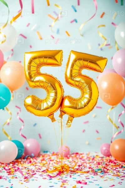 Гелиевый баллон на день рождения номер пятьдесят пять, фигура из золотых букв 55 праздник праздничный фон