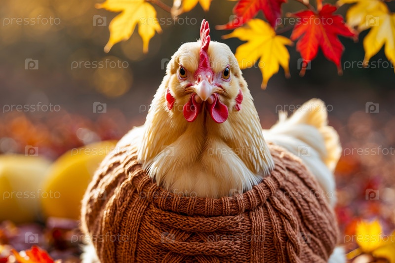 AI Generative Курица в трикотажном свитере на осеннем лесном фоне, животное с красными и желтыми листьями