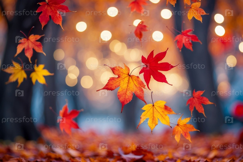 Генеративный искусственный интеллект Фон осенней атмосферы с желтыми и красными листьями, падение листьев в лесном парке