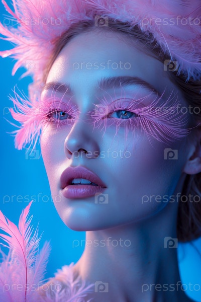 AI Generative Fantasy портрет молодой красивой женщины волшебная модель в красочных розовых перьях из сказки